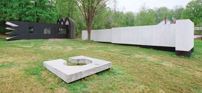 Deliberately Kafkaesque in both name and intent, the project represents Poughkeepsie, N.Y. and Tokyo–based designer Ben Ryuki Miyagi’s vision of a modest, nondescript dwelling “transformed into a black, mysterious house with grotesque, yet poetic, features.” Miyagi flattened the shed roof of the Saugerties, N.Y., ranch house, adding a saw-tooth, polycarbonate-lined “light collector” at one end and a trio of half-domed, asphalt-clad towers at the other. In between, flat black walls are punctuated with fixed glazing in openings whose shapes undermine the viewer’s schema of “window.” The ungainliness of the forms is intentional; the crudity of their execution may or may not be.