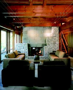 AN EFFORT TO INCLUDE MATERIALS REFLECTIVE OF THE SURROUNDING environment shaped the planning of this living room. The bluestone and limestone are a nod to the abandoned quarry on which the house sits, while the Douglas fir ceiling and truss work evoke images of the nearby tree-lined river.