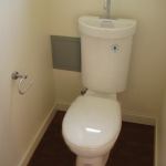 The Caroma dual-flush toilet has an integral sink. Water used for hand washing drains into the tank for use in the next flush.
