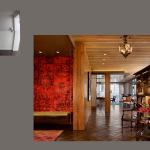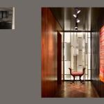 Inspired by the original hand-scraped wood floors and lacquered ceiling sections, Webber covered several perpendicular connecting walls in red tile, leather, white gold, polished brass, and art glass, “to give a splash of material richness,” he says.