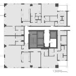 The solution: a series of parallel wood-clad slab walls that create public sub-zones for catering, living/dining, and coat storage, plus a polished lobby that serves both units. “The condo is on the southwest corner of the building, and the walls are running north-south to buffer the late afternoon sun,” Webber says. They’re wrapped in bleached walnut, which has the tonal effect of white oak and highlights the walnut grain. A walnut-clad wall reappears in the couple’s quarters, carrying the concept from one side to the other.