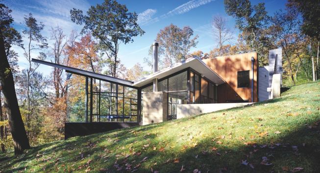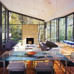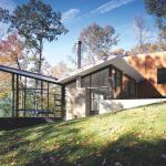 Geometry is destiny for this house on a wooded site outside Washington, D.C. Architect Bob Gurney designed it as two interlocking volumes, one clad in mahogany and the other in glass. The rectangular, wood-skinned portion contains private spaces like bedrooms and bathrooms, while the transparent one holds the home’s living and dining areas. A corner of the latter comes to a sharp point that juts out into the site, letting outdoor views permeate the interior. “It’s like being outside,” said a judge, and from what Gurney says, his clients and their guests must concur. “Everyone heads to that mitered glass corner,” he observes.