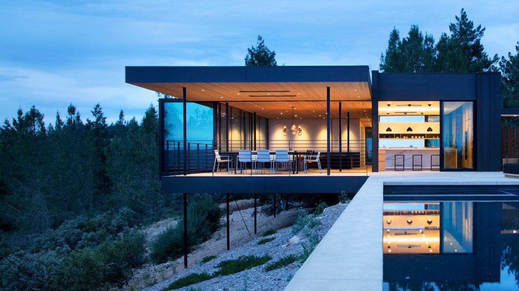 The Glen Ellen Aerie is a dramatically sited residence that floats above a 20-acre property in the foothills of Northern California’s Mayacamas Mountains. San Francisco–based Aidlin Darling Design designed the 3,089-square-foot home to maximize views of the Sonoma Valley and please the owners’ request for a single-story residence where they could spend their later years without concerns about mobility.