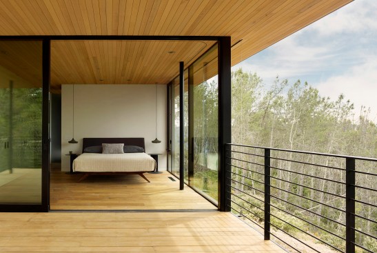 Floor and ceiling materials are continuous from interior to exterior, stressing the links between the two. At the south end of the main volume, floor-to-ceiling glass doors between the dining room and south facing deck fully retract into a glazed box that is dramatically cantilevered over the valley. On the opposite end of the main wing, a slightly more conventional sliding glass door detail is used between the master bedroom and the north-facing deck.
