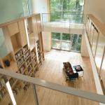 Windows in the tower, which contains an airy two-story library, recess into and push forward from the structure, which gives them a three-dimensional feel. “The windows start to have life instead of a flat skin,” Bloomberg says. The large windows also frame the landscape. “There are a series of shapes, so you see the landscape in a different way as you move up the tower,” she says. Instead of residential units, the large openings use more cost-effective commercial aluminum windows.