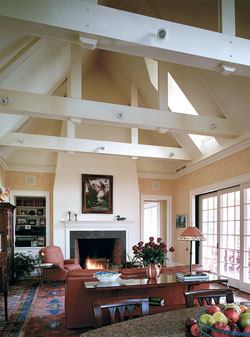 The hyphens that architect Stephen Muse used to connect structures in St. Mary’s County, Md., were more than just a way to satisfy the easement requirements. He made sure they did double-duty inside. The hyphen connecting the original house with the great room (shown here) now works as the entry foyer and contains a powder room; the hyphen connecting the great room with the master suite is roomy enough to accommodate a bed for visiting grandchildren. “I really wanted to make things have dual uses,” says Muse.