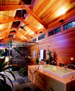 Completing the natural setting is the walk-in terrarium. Plants growing from its stone wall provide food for lizards, and special light filters on the clerestory window panes prevent harmful rays from reaching them. For more creature comfort, a dedicated HVAC system keeps temperature and humidity at lizard-friendly levels. The panel judged this bath a great place for man and beast.