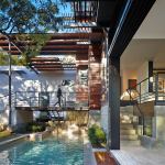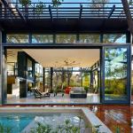 On Site With water at a premium, pools need to serve multiple functions. Grable tucked one under a front-entry bridge that runs parallel with the façade and designed it for swimming, as a fountain, reflection pool, and grotto-style waterfall.
