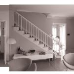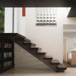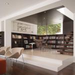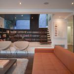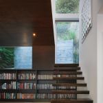 The interplay between the jogged levels is further enhanced by what the architects refer to as a “material inversion.” Responding to the living room’s ebony fired oak floor and a white ceiling, the library is flipped, sporting a white epoxy resin floor with an ebony oak ceiling—an exercise in perspective that extends sight lines and draws the eye out to the backyard, where grade is level with the tops of the bookcases. Large windows and a skylight above the stairs (which wrap around the landing and go up another level) flood the space with light. After all, a good reading space requires good light.