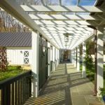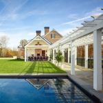 Dining, living, and family rooms are housed in the brick section, with the clapboard appendages—a master suite and the kitchen/pantry/mud-room—at opposite ends of the house. A long pergola links the kitchen and outdoor dining area to the swimming pool and guesthouse, whose board-and-batten siding recalls vernacular outbuildings—“a less expensive, more informal way to go,” notes project architect Tim Clites.