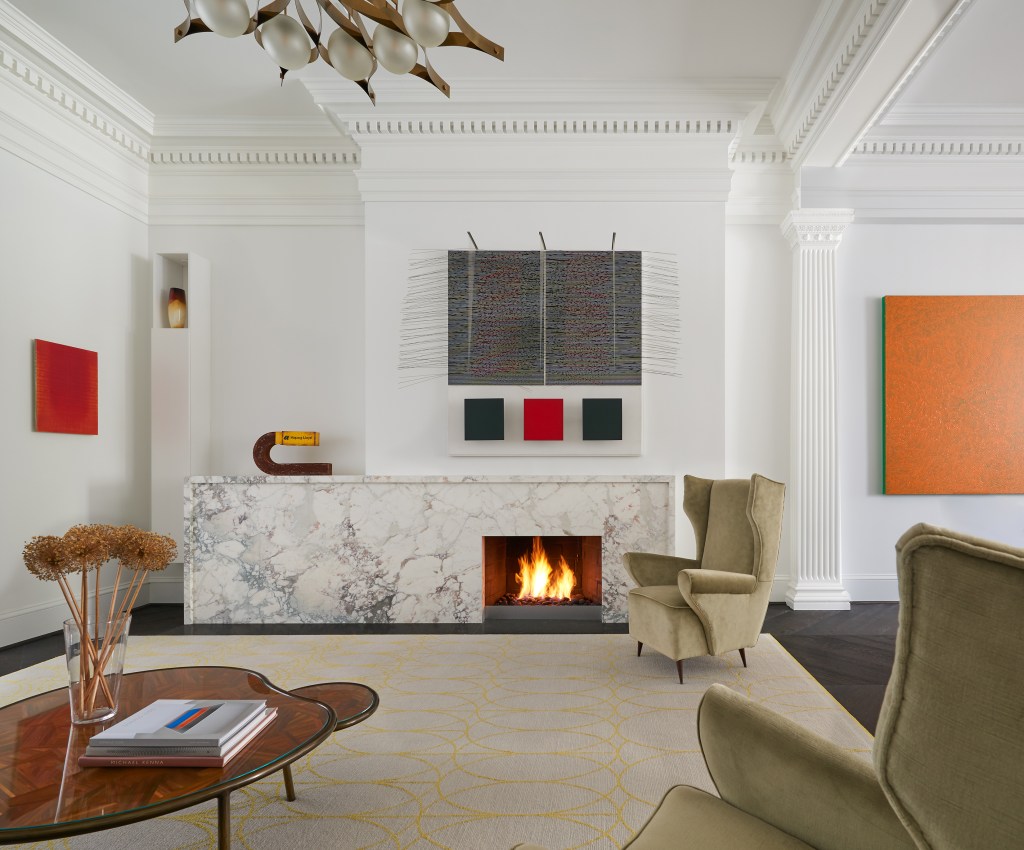 Original crown moldings and robust columns in the main living room, plus wood flooring on the upper floors, were kept and restored, while new elements, such as the asymmetric marble fireplaces and statement lighting features, were added to complement the older details.