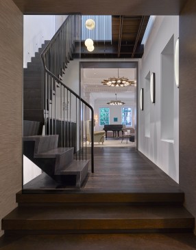 As part of that process, Gurney and his design team were able to create an open, elongated first floor from the front entrance to the kitchen in the rear. To further foster interior connectivity, they added a central modern stair that rises from the basement to the third level, and a bridge provides access from the master suite to an office.