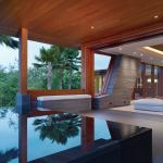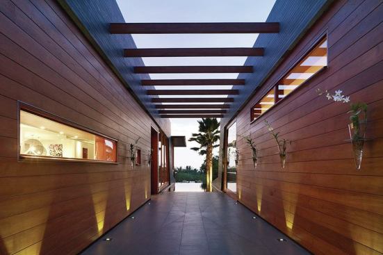 Each pavilion is clad in recycled teak planks and stacked lava rock, which also covers the patios, reflecting pool, and swimming pool. “The bulk isn’t just about thermal mass but about engineering,” Belzberg says. “Every year we have quite a few small earthquakes and gale-force winds, so the building is pretty heavy.”