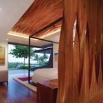Inside, though, are graceful references to island culture. The living room’s billowing ceiling, digitally cut from a glulam beam, is an abstracted grass skirt and a nod to the island’s wood-carving tradition. In the master bedroom, the headboard and ceiling suggest palm trees. Local basketweaving culture inspired the entry sculpture, an oversized, inverted basket made of strips of marine plywood, which re-enacts the Hawaiian custom of presenting guests with a gift. A judge appreciated the sense of “delight and surprise, and the sensual quality and landscape connection.”