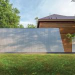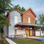 The two-story cedar-plank-clad volume matches the house’s dime… The two-story cedar-plank-clad volume matches the house’s dimensions. Corrugated metal on the one-story volume suggests the building’s new use as a recording studio.