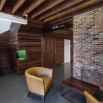 The house’s framing reappears as interior wall framing, finish… The house’s framing reappears as interior wall framing, finishes, and furniture. A new ceremonial fireplace is made of brick salvaged from the original fireplace and chimney.
