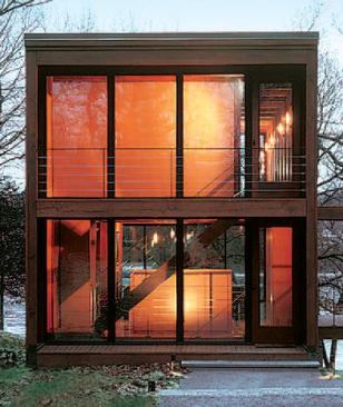 Concrete block foundation, plywood siding, concrete floor. That may sound like the shed your uncle built for his riding mower, but in this Wisconsin lakefront retreat, those humble materials respond to a much higher calling. Designed for a long, narrow site, the house adopts the same bread-loaf proportions as its lot. That simple shape, and panelized construction, made for an extremely straightforward process in erecting the building shell. Wall sections are sided with high-quality veneer plywood in full sheets, with vertical joints covered by batten strips. Window and door openings also follow a 4-foot-wide module, lending a calm and orderly feeling that led one judge to dub this a “Zen house.”