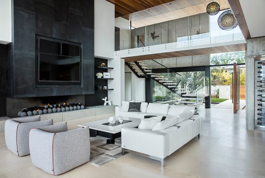 According to the firm, the home’s main living spaces were treated as one large glass volume and then layered with solid mass, such as the concrete wall. The double-height living room features a 12-foot custom fireplace clad in steel paneling, while the open-concept kitchen conceals a butler’s pantry behind the range wall. Expansive window walls with exposed steel elements open both areas to the adjacent exterior patio with an outdoor kitchen, infinity pool, and spa.