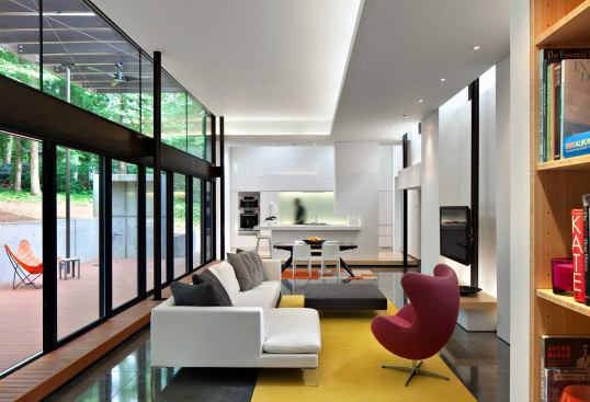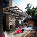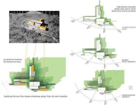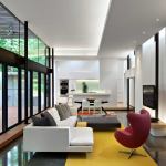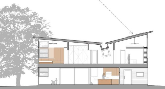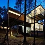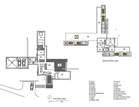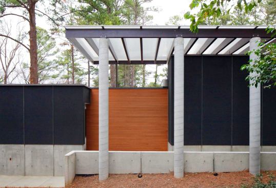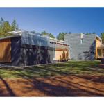 GREENville House/Walters Residence is composed of two primary design components: bars and panels. Each part works together to generate an environmentally sensitive response. Narrow bars branch out into the landscape to create courtyards, capture natural light, allow cross ventilation, and intersect to form a central volume of double-height public space. A structural system holding photovoltaic panels and perforated screens is responsible for creating the home’s energy and hot water while shading openings to alleviate unnecessary heat gain. Jurors’ comments: A large and ambitious house with many materials and details. Well-proportioned and vigorous, the house displays an uncommon passion for architecture. The materials and forms are stitched together like a beautiful quilt.