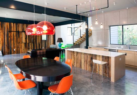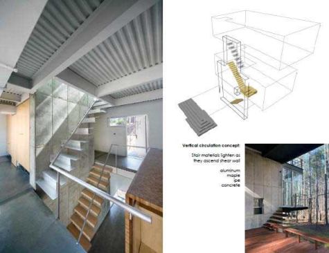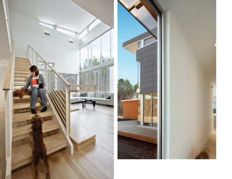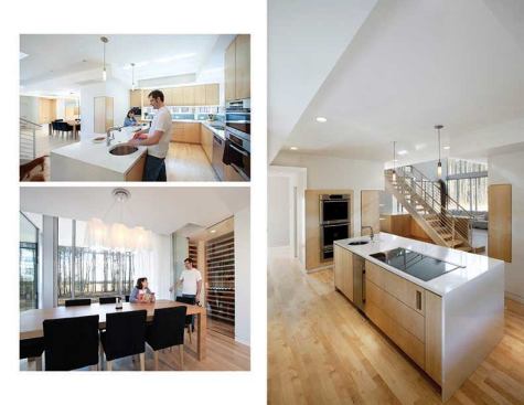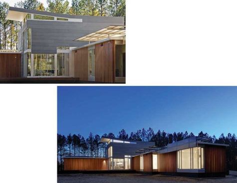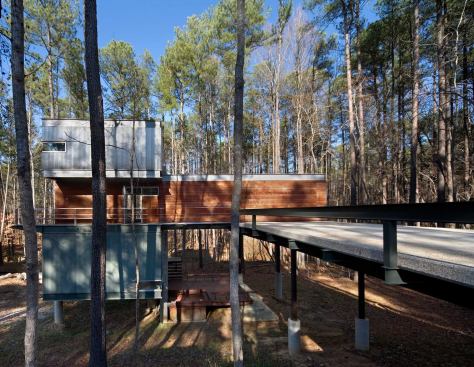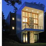 Jury Selections – Second Place: 1804 Pictou Road, Raleigh, N.C. Architect/Builder: Mike Rantilla, AIA, LEED AP Architect’s description: The unique form of the building is a literal response to the significant site challenges. Wedged between zoning setbacks, a stream buffer, and a steep slope, the program massing was squeezed vertically into a three-story scheme. Each floor level is expressed as a discrete rectangular volume clad in a different material and spun radially from a 40-foot-tall, 18-inch-thick solid concrete shear wall. This articulation of the volumes creates a wide variety of habitable outdoor spaces. The height of the mostly transparent upper volume set within the forest canopy evokes the feeling of a tree house. Jurors’ comments: This house works well on its forest hillside site, and must be a dramatic and wonderful place to live—a mixture of structural boldness and domestic intimacy. The house has a case study quality about it. As the case studies were often influential, we expect this building will be, too.