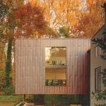 Architect David Jameson conceived the two forms as an interplay between heavy and light, as well as past and present. “The two bars slip past each other,” he says. “One is rooted to the ground, and one is a very light garden pavilion.” Influenced by the anti-ornament writings of the Czech-born, early-20th-century architect Adolf Loos, Jameson re-clad the existing brick house in plain stucco to create the heavier front element. Stone walls further anchor it to the site. Its almost anonymous look recalls the International Style houses of the 1920s and ’30s. The buoyant, all-new copper pavilion, meanwhile, cantilevers over a ground-floor window wall, thanks to modern-day engineering. As it fades to bronze and eventually green, its colors will blend in with the leaves around it.