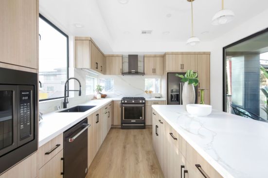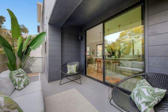 The second floor’s open concept main living area includes a large kitchen with an island, a dining room, a half-bath, and a roomy patio balcony that is partially shaded by the third floor. The top level’s large windows provide views of Los Angeles and abundant natural light into the two bedrooms and baths. Rodriguez & Satterthwaite led landscape design, and Madison Modern Home and Fixe Design House designed the interiors.
