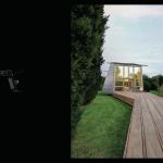 At the main house’s entrance, the decking wraps up and over a … At the main house’s entrance, the decking wraps up and over a glass slot.