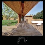 The mahogany decking consists of 1 ½-inch-square timbers … The mahogany decking consists of 1 ½-inch-square timbers flanking 9 ½-inch boards, a pattern the architects abstracted throughout the house. In the kitchen, for example, the ceiling boards drop out to create a trough for light fixtures. “You’re not just punching holes all over the place to put in these things that need a home, but integrating them into the system,” Masi says.
