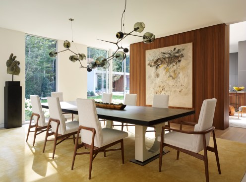 A wood-clad “tube” inserted through the center of the house provides a distinctive and inviting entry that establishes a central axis that leads to a new pool house at the rear of the 1.9-acre site. Raised several steps above the first floor, the designers introduced a series of spaces that blur the distinction between inside and out with an interior entry hall and exterior outdoor patio that can function as a covered outdoor dining area. A large skylight at the center brings abundant natural light into the home, and pairing the central tube with the pool house clarifies the geometric organization of the backyard while deftly incorporating the original swimming pool into the overall composition of the house and landscape.