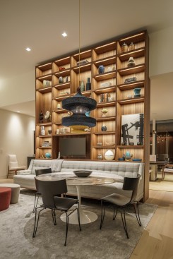 Old Orchard began its life as a modern spec house in East Hampton, N.Y., with a somewhat quirky two-level plan and a relatively nondescript modern architecture. Its owners occupied the structure for a year before commencing with the design process for remodeling and expanding it to meet their family’s specific needs and desires. Bridgehampton, N.Y.–based Blaze Makoid Architecture introduced four discrete interventions—a central addition through the main portion of the 10,000-square-foot house plus three small new structures totaling about 1,500 square feet—that dramatically transform the look and feel of the original while maintaining a fresh and clean modern expression.
