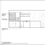 Unique storage solutions include a roll-up small appliance garage in anodised aluminum that also provides a pull-out breakfast bar and additional work surface.