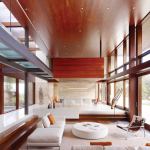 According to architect Robert Swatt, the clients requested a home that made them feel as if they were on vacation. “They wanted something comfortable, casual, barefoot,” he says. So he centered the floor plan on a mahogany-lined, double-height great room that’s visually open and easily accessible from both the outdoors and from other interior areas. Ceiling height changes, floor treatments, and small level shifts delineate different parts of the space, creating a multifunctional zone that still forms a cohesive whole.