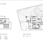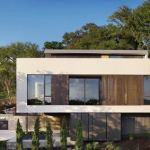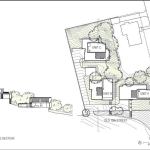 The acre plot sits between a single-family neighborhood and commercial properties along a boulevard farther down the hill, and the new flag-lot subdivision is accessed from the commercial street. For economy, the buildings were mostly stick-framed and share a similar material palette. Each stucco-and-cypress-clad home has a green roof that blends into the thick underbrush when viewed from higher on the hillside.
