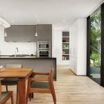 It’s one thing to design a modernist pavilion in the woods, but quite another to do it in a dense urban setting. Alterstudio deftly balanced openness and privacy by fitting each living area and master bedroom with a wall of glass that connects to discrete outdoor space, and with roof planes that carry out past the glass. Select gestures such as richly grained walnut cabinetry and exterior wood screens enliven an otherwise modest composition. “It’s like wearing a beautiful tie with a straightforward suit, and is a counter-argument to the prevailing trend in modern work,” Alter says. “Rather than fetishizing the building, we like to use things with an inherently complex character.”