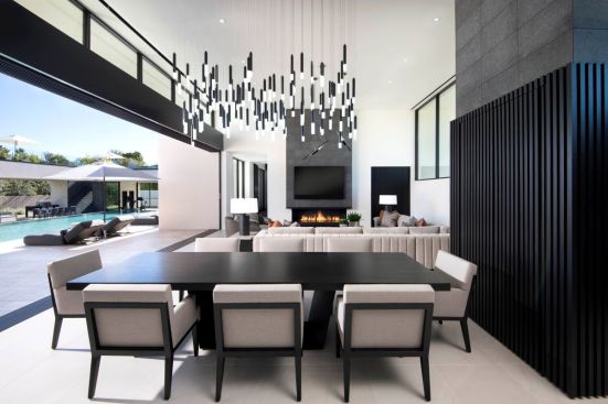 A 50-foot-long pocket door completely opens the entire main living area, which includes the kitchen, dining, and great room, to the pool and pavilion. Offering interest and contrast to the space, a black block wall houses the homeowner’s wine collection.