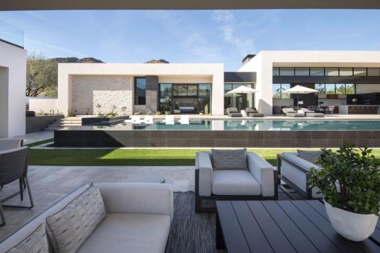 Set between Camelback Mountain and the Four Peaks, Part and Counterpart’s unique two-“L” layout presents the perfect opportunity for indoor-outdoor living. The entry’s glassed-in atrium showcases the pool and connects the guest quarters on the left of the home with the main living spaces to the right.