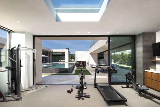 The negative-edge pool is nestled between the house and a two-story wellness pavilion, which boasts an exercise room beneath a glass-bottom spa on the second level in addition to seating and fire features on both levels.