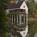 Pond House takes its name from its site, at the edge of a tidal saltwater pond on Maine’s Mount Desert Island. Architect Matt Elliott took advantage of the grandfathered location to replace a decaying 1950s residence with a family vacation compound that turns the clock both backward and forward. For the site plan and building forms, Elliott drew inspiration from the old wharves and fishing shacks that dot the shoreline here, using decks to connect the compound’s three pavilions and mediate between the buildings and the landscape. “We love the spaces created between the buildings when you do that,” Elliott says.