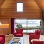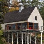Inside, however, the exterior’s subtly abstracted vernacular gives way to a modern composition that mixes natural, local materials with select bits of stainless steel. “You see this sort of fishing village complex of buildings,” Elliott says, “and you walk inside and see something entirely different.” The central pavilion, which contains the kitchen, dining, and living spaces, projects over the pond, carrying at its center a 12-ton boulder that serves as the fireplace hearth. Wide sliding doors allow the living spaces to spill out onto decks cantilevered above the water.