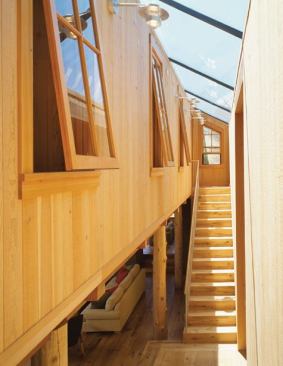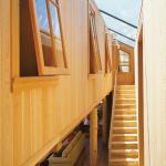 The main structure—made of sprayed earth from the site, recycled cedar siding, and certified lumber—is linked to the hillside cabins with an exterior arcade. “As you move up the steps, the walkway frames the oaks and connects your experience of being there to the larger landscape,” Griffin explains.
