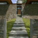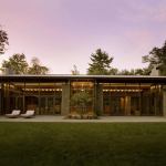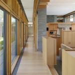 The building’s material palette draws heavily on the densely laid bluestone that forms its landscape walls and girds its outward-facing elevations. The same material figures prominently inside the house, though in a more refined form. “As the stone walls slide into the building we polish them,” Cutler says. The remainder of the finish schedule consists of steamed beech and pear wood casework, red oak floors, and exposed Douglas fir framing members.