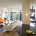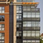 Q14 Condominiums has a decidedly modern mien, but it fits the scale and proportions of the commercial buildings on one adjacent street and the traditional row houses on another. Located along the rapidly changing 14th Street corridor in the nation’s capital, the building consists of two interlocking forms that pinwheel around a taller volume. Multilevel bays allow floor-to-ceiling glass, which brings maximum light to the open-plan, modern interiors. Each unit also offers much-appreciated private balconies with mahogany and steel trellises for shading.