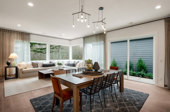 Sharp, yet simple, exterior lines welcome guests to Quadrant Homes’ Ray Meadows neighborhood outside Seattle. Located just miles away from scenic parks, shopping centers, and the Microsoft Millennium Campus, the 27-home community in Bellevue, Wash., is also sited near generous open green space. By utilizing zipper lots, the builder exposed many of the homes to the landscape and provided outdoor living spaces with either a private side yard or enhanced driveway area.