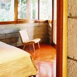 The restoration included refurbishing original red concrete floors, shown here in the guest room.