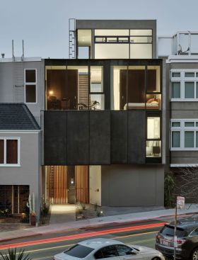 Walking along the charming row houses of San Francisco, one may think that Twin Peaks Residences is a newly renovated single-family home. Positioned behind the structurally robust steel framework and cement plaster are three separate units. A wood-slatted gate conceals the exterior stairway that leads to each unit. While configuration is unique, the one-, two-, and three-bedroom homes all carry the same quality, design, and finishes.