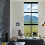 The living pavilion, which is designed as a singular open space, offers 14-foot-high ceilings, warm flooring, a fireplace, and a full-height window at the end to frame the mountain views. The living room window was the only custom window of the project, Gurney points out.