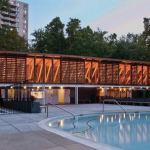 From Memorial Day to Labor Day is high season for this carefully restored pool house. Just outside the city limits of Washington D.C. The shed roof and its deep overhang extend beyond the building’s original walls to provide protected and shady areas. The deep roof overhangs also were designed with the future in mind. It’s now possible for nano glass walls to be installed so that winterization of the some of the spaces of the building—which went from neglected to hugely popular—would eventually be possible.