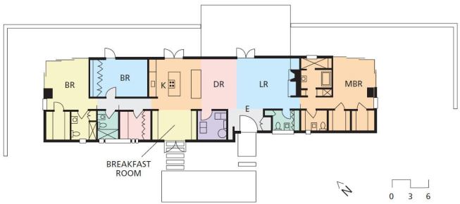 In addition to its beauty and sense of solidity, rammed earth also has sustainability on its side. The material is non-toxic, locally obtained, and made from an abundant natural resource. But the house comes up green in other ways, too. Aidlin, partner David Darling, and project architect Peter Larsen set up the floor plan to maximize energy efficiency, lining much of the east elevation with glass to capture the winter sun. During the summers, of course, the owners desire the opposite effect, which is where extra-long roof overhangs come in. “The eaves cantilever 8 to 10 feet past the building envelope,” says Aidlin. A pop-up clerestory running along the home’s main circulation spine helps with natural ventilation and daylighting.