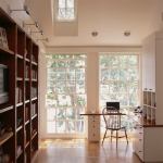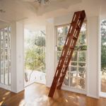 “We wanted to preserve the view on the second and third floors, but we also wanted operable glass in the tower, so we used butted glass corners, but in the center inserted double-hung windows,” Good explains. Continuous use of similar design elements inside and outside furthered a feeling of transparency. Crisp interior millwork meant to resemble the batten siding extends up a central stairwell inset with gridded window panes.