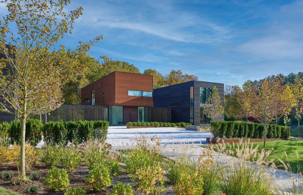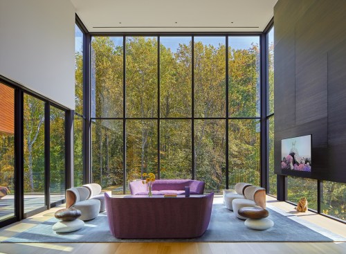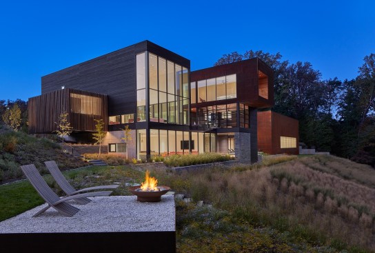 Balancing shifting volumes and planes along sloping topography, the Spring Mill House’s wooded site with pond was favorable because of the ability to submerge part of the structure into the hillside. Its indoor spaces are flooded with natural light from abundant glazing, promoting connectivity with nature. “Indoor and outdoor flow is seamless, providing an environment where spaces for health and wellness are equally integrated with spaces for work, gathering, relaxation, and contemplation,” the project application reads.